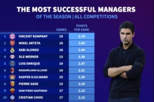 體育資訊11月28日訊 本賽季五大聯(lián)賽中,拜仁和阿森納均有著極為出色的表現(xiàn)。德國轉(zhuǎn)會市場盤點了五大聯(lián)賽主帥場均拿分情況,孔帕尼、阿爾特塔和阿隆索位居前三。值得一提的是,這三名主帥都是名副其實的少壯派。