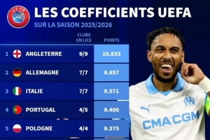 體育資訊11月29日訊 德國轉(zhuǎn)會(huì)市場列出了本賽季歐戰(zhàn)積分排名,英超、德甲前兩位,意甲升至第三位。