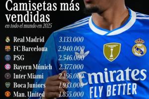 體育資訊11月29日訊 體育畫報(bào)依據(jù)Euromericas Sport Marketing數(shù)據(jù),統(tǒng)計(jì)了2025年截至目前世界足壇俱樂部球衣銷量榜,皇馬以313.3萬件位居榜首,巴薩、巴黎分列二、三名。