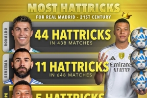 體育資訊11月29日訊 Score90統(tǒng)計(jì)了本世紀(jì)球員在皇馬上演帽子戲法的次數(shù),并列出榜單,C羅44次居首,本澤馬11次第二,姆巴佩5次。