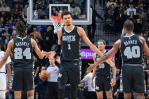 要聊這支馬刺,你永遠(yuǎn)繞不開文班亞馬,就像聊三分球繞不開庫里一樣。經(jīng)過兩年進(jìn)化和少林特訓(xùn),22歲的文班已顯現(xiàn)出超巨之姿,場均26分12籃板4助攻3.6蓋帽,真實命中率61%。開賽前五場更是轟出了30分15籃板5蓋帽的場均數(shù)據(jù),帶領(lǐng)馬刺豪取五連勝,把仗著內(nèi)線深度試圖單防文班的獨(dú)行俠打出33分分差,讓所有球隊都不敢單防。
