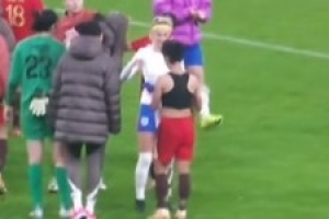 賽后,中國(guó)女足球員張琳艷和英格蘭女足中場(chǎng)凱莉現(xiàn)場(chǎng)交換球衣。