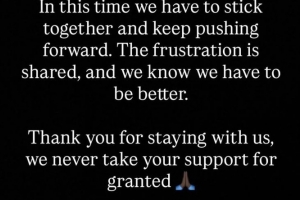 中場帕佩·薩爾在賽后通過社媒發(fā)文向球迷們致歉:“在這段時期,我們必須團(tuán)結(jié)一致,繼續(xù)前進(jìn)。我們同樣感到沮喪,并且深知我們必須做得更好。”