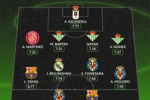 中場(chǎng):亞馬爾(巴塞羅那,8.77分)、貝林厄姆(皇家馬德里,7.74分)、桑蒂·康薩尼亞(比利亞雷亞爾,7.66分)、阿爾貝托·莫萊羅(比利亞雷亞爾,7.98分)