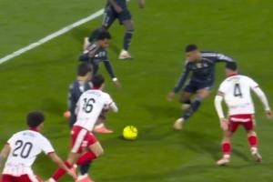 西甲第14輪,皇馬客場1-1戰(zhàn)平赫羅納,讀秒階段皇馬獲得絕殺機會,貝林厄姆禁區(qū)橫敲,正對球門的羅德里戈調(diào)整步點準備射門,這時正對來球但側(cè)對球門的姆巴佩半路殺出,轉(zhuǎn)身兜射打偏。