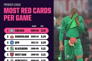 平均3場1張紅牌!切爾西本賽季場均紅牌0.31張,英超歷史最多