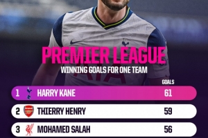 體育資訊12月2日訊 在足球比賽中,為球隊打進(jìn)制勝球無疑是最令人激動興奮的。據(jù)Opta數(shù)據(jù)統(tǒng)計,英超歷史上,為單一俱樂部貢獻(xiàn)制勝球最多的榜單中,英格蘭射手凱恩為熱刺隊打入61粒制勝球,位列榜首。