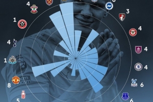 體育資訊12月3日訊 哈蘭德達成英超百球里程碑,英超官方也曬出哈蘭德百球攻破球門對手分布,具體如下: