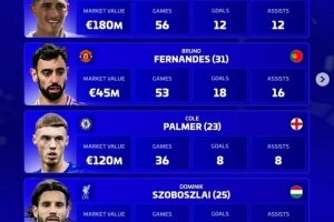 B費(fèi)(曼聯(lián),31歲,葡萄牙):身價(jià)4500萬(wàn)歐,53場(chǎng),18球,16助攻