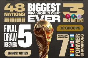 2026世界杯抽簽將于12月06日星期六01:00進(jìn)行,為預(yù)熱抽簽儀式,世界杯官推曬海報(bào)盤點(diǎn)本屆世界杯的數(shù)據(jù):