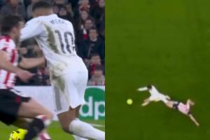 西甲第19輪,皇馬3-0客勝畢爾巴鄂競(jìng)技,姆巴佩2射1傳。其中第一球,姆巴佩接到阿諾德的長(zhǎng)傳,卸球轉(zhuǎn)身擺脫左后衛(wèi)萊奎、帶球推進(jìn)、弧頂變向過掉中衛(wèi)拉波爾特、射門得分,這個(gè)過程一氣呵成,萊奎防守姆巴佩時(shí)上手拉、下腳鏟都沒攔??!