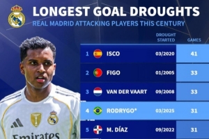 新世紀皇馬攻擊手最長進球荒榜:伊斯科41場 羅德里戈31場暫列第4