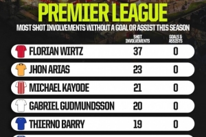 體育資訊12月5日訊 上輪利物浦對陣桑德蘭的比賽中,維爾茨的折射進(jìn)球被英超官方算為烏龍。這位夏窗標(biāo)王的英超首球還得再等。據(jù)Opta數(shù)據(jù)統(tǒng)計(jì),本賽季零進(jìn)球、零助攻情況下,最多射門參與次數(shù)排名中,維爾茨以37次高居榜首。