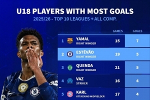 體育資訊12月6日訊 德國轉(zhuǎn)會(huì)市場統(tǒng)計(jì)了本賽季前十聯(lián)賽U18球員的進(jìn)球數(shù)量,并列出榜單,亞馬爾7球居首,埃斯特旺5球并列次席。