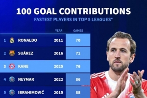 本世紀(jì)五大聯(lián)賽最快參與100球排名:C羅居首,蘇亞雷斯、凱恩前三