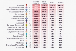 體育資訊12月9日訊 本賽季歐冠聯(lián)賽階段第6輪的比賽即將開打,opta在當(dāng)?shù)貢r間12月9日對本賽季歐冠的形勢進(jìn)行了新一輪預(yù)測,阿森納奪冠概率22.6%最高,拜仁、巴黎排在二三位。