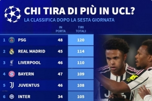 體育資訊12月11日訊 德國(guó)轉(zhuǎn)會(huì)市場(chǎng)統(tǒng)計(jì)了本賽季歐冠各隊(duì)的射門次數(shù),并列出榜單,巴黎120次射門居首,皇馬、利物浦二三位。