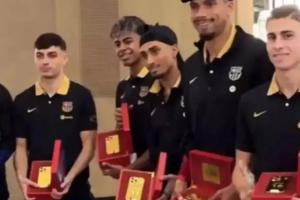 類似豪禮在巴薩更衣室里其實并不新鮮。去年巴薩全隊前往沙特阿拉伯參加西班牙超級杯時,每位球員也收到了一部黃金手機(jī),那次是由International Data Group(IDG)公司贊助的。