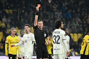 本場(chǎng)比賽第32分鐘,里爾18歲的小將布阿迪在本方禁區(qū)內(nèi)出現(xiàn)嚴(yán)重失誤,他在試圖處理球時(shí)將球停到了對(duì)方球員的面前,隨后不得不將其拉倒,主裁判出示直紅將其罰下并判罰了點(diǎn)球!