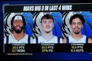 賽前,轉(zhuǎn)播方給出獨行俠過去4場勝利,濃眉、弗拉格、小納姆哈德三人組的數(shù)據(jù):