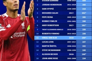 利物浦隊(duì)史英超出場(chǎng)榜:范戴克250場(chǎng)第11,阿諾德259場(chǎng)第9