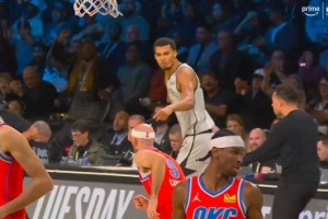 GIF-文班亞馬面對(duì)卡魯索干擾打進(jìn)中距離 然后回頭手指著對(duì)手振振有詞
