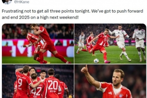 本場比賽凱恩點射破門,賽后他在社媒鼓勵球隊寫道:“很失望今晚未能全取三分,我們必須全力以赴并在下周比賽中為今年完美收官?!?/p>