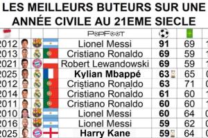 在21世紀(jì)自然年進(jìn)球榜上,姆巴佩63球的成績已經(jīng)超越2012年的C羅來到第4。在2025年皇馬僅剩2場比賽,想達(dá)到2013年C羅、2021年萊萬的69球已經(jīng)幾乎不可能。在這份榜單的榜首,2012年梅西的91球仍遙不可及。