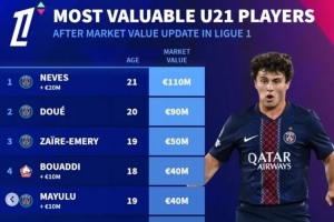 德轉(zhuǎn)列法甲U21身價(jià)榜:內(nèi)維斯壓杜埃居首,布阿迪、馬尤盧在列