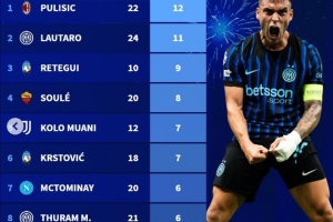 2025年意甲球員客場(chǎng)進(jìn)球排行:普利西奇12球第一,勞塔羅11球第二