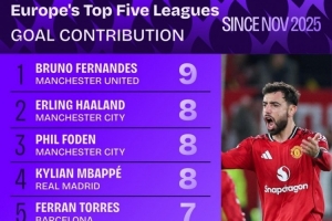 據(jù)Squawka統(tǒng)計,B費今年11月以來聯(lián)賽參與9粒進球,五大聯(lián)賽同期參與進球最多。