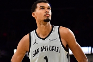 文班亞馬替補(bǔ)出戰(zhàn),他首節(jié)出戰(zhàn)05分13秒,4投1中,三分1投0中、沒有罰球,拿到2分2籃板,正負(fù)值-6。