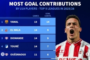 體育資訊12月18日訊 《轉(zhuǎn)會市場》統(tǒng)計了本賽季五大聯(lián)賽U19球員直接參與進(jìn)球榜,亞馬爾無懸念領(lǐng)跑。