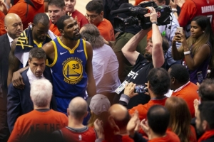 杜蘭特回憶道:“我記得當時兩場比賽之間大概有兩天時間,所以我基本上24小時不間斷地在接受治療,我甚至要跑到多倫多城外大概45分鐘車程的地方,去做那種水下跑步機的訓練??傊?,我盡了一切努力去恢復,我想回來打球,我開始感覺好一些了,然后在比賽前一天,我和隊友們打了三對三的訓練。”