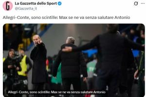 比賽結(jié)束后,阿萊格里徑直走回更衣室,未與孔蒂握手致意??椎賱t留在場(chǎng)上向?qū)κ种乱?,與阿萊格里的長(zhǎng)期助手馬爾科·蘭杜奇以及米蘭球員們握了手。