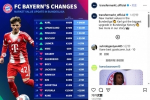 體育資訊12月19日訊 德轉(zhuǎn)公布了拜仁球員的身價變化,其中,小將倫納特·卡爾的身價上漲了4000萬歐元,來到6000萬歐元,凱恩和穆西亞拉的身價都下降了1000萬歐元。