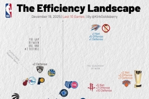 橫軸代表進(jìn)攻效率,越靠右越好,縱軸代表防守效率,越靠上越強(qiáng)。第一象限的球隊多為發(fā)揮出色的球隊,而在第三象限的球隊通常為戰(zhàn)績比較糟糕的球隊。
