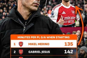 2024年8月以來,阿森納球員在英超中首發(fā)時,梅里諾是進攻端最高效的球員,他每135分鐘就直接參與1球,位居他身后的是熱蘇斯(142分鐘)、哈弗茨(169分鐘)以及約克雷斯(221分鐘)。