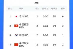 A組積分榜,日本U15兩連勝進5球0失球小組第一,中國香港U15兩場1勝1負第二,韓國U15兩場1負1平第三,國少兩場1負1平進1球丟4球繼續(xù)墊底。