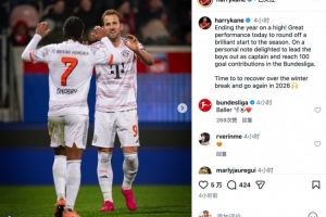 凱恩社媒:達(dá)成個人德甲參與100球里程碑,2026我們再接再厲??
