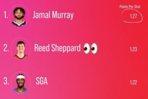 平均每次跳投得分:穆雷1.27分第1 謝潑德1.23分第2 SGA1.22分第3