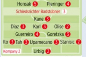 體育資訊12月22日訊 德甲第15輪比賽,拜仁客場(chǎng)4-0擊敗海登海姆,德國(guó)媒體《圖片報(bào)》對(duì)球員進(jìn)行評(píng)分,烏爾比希、奧利塞、斯坦尼西奇2分最高。