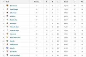 西甲2025年度積分榜:巴薩96分居首,皇馬86分次席,馬競第4