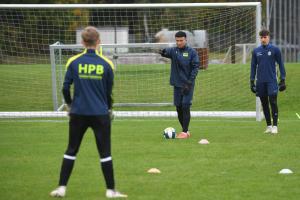10月22日,在奧地利薩爾茨堡守門員學(xué)院訓(xùn)練場,李實(shí)(中)在指導(dǎo)學(xué)員訓(xùn)練。新華社記者 賀燦鈴 攝
