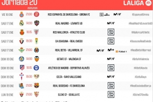 西甲第20輪時(shí)間:1月17日21點(diǎn)皇馬vs萊萬(wàn)特,19日4點(diǎn)皇社vs巴薩