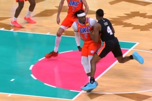 福克斯強(qiáng)突多特對(duì)抗后差點(diǎn)丟球&裁判吹多特犯規(guī) 雷霆挑戰(zhàn)但失敗