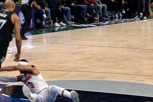 GIF-戈貝爾和哈特搶籃板對抗激烈 哈特倒地后扒拉了一下戈貝爾膝蓋引發(fā)沖突