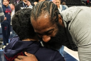 快船曬哈登與中國(guó)留學(xué)生約翰·郝?lián)肀д眨焊兄x哈登的幸運(yùn)符??