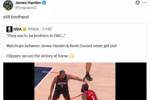 賽后,NBA官推曬出哈登與杜蘭特對位的集錦,并配文道:“他們在雷霆時曾經(jīng)是兄弟,哈登與杜蘭特的對位百看不厭,快船在主場確保了勝利?!?/p>