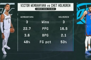 據(jù)統(tǒng)計(jì),文班亞馬和霍姆格倫生涯至今交手6次,雙方各取3勝。
